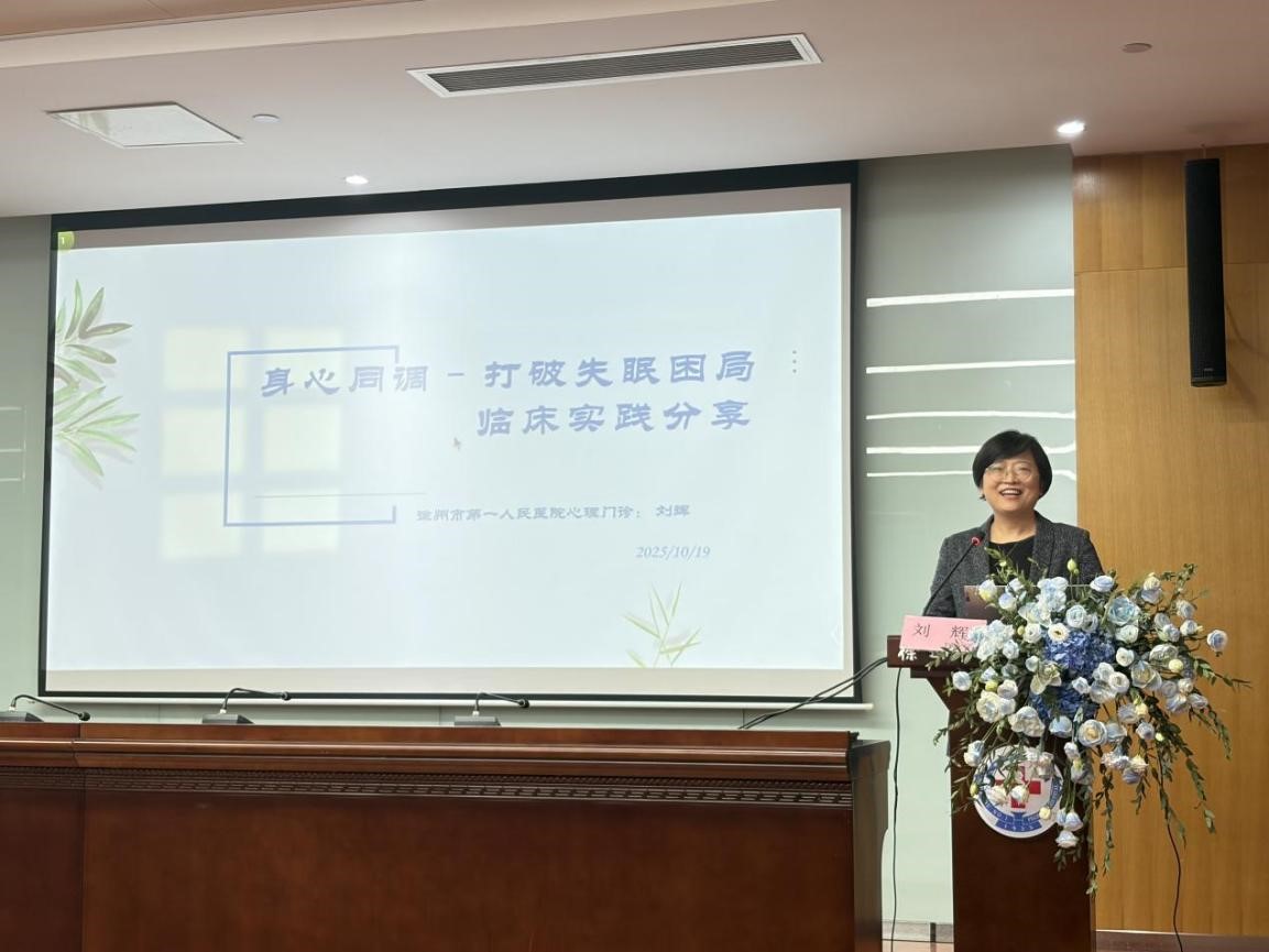 徐州市第一人民医院心理科刘辉主任以《身心同调–打破失眠困局》为题,系统介绍了针对失眠的“药物+非药物+心理”三管齐下综合干预模式;通过临床案例,阐释了如何将西药快速控制、中药辨证调理、声光振物理治疗及音乐心理治疗相结合,实现“先调神,再调身”的临床实践路径。